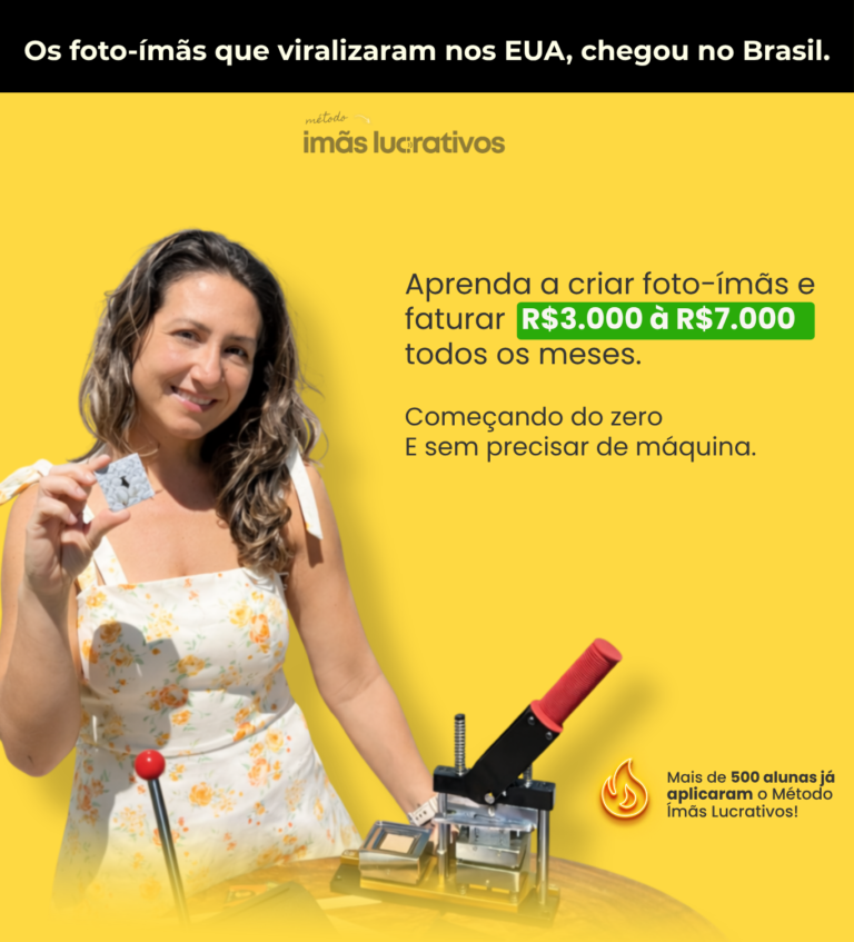 É um treinamento completo que te ensina a produzir foto-ímãs personalizados de quatro formas diferentes (com e sem máquina), vender de forma simples e transformar isso em uma renda mensal que pode chegar a R$3.000 ou mais.